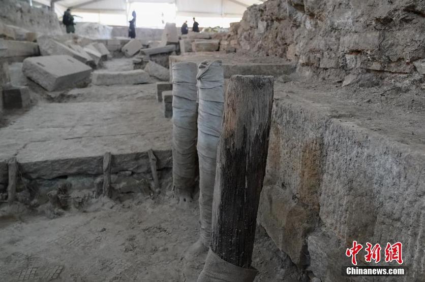 后来,同治皇帝曾命人对其进行重点修复,但并未完成便停工,大宫门就此在随后的一百余年时间里逐渐荒废。2002年至今,圆明园管理处对大宫门遗址进行了四期考古发掘工作,现已基本发掘清理出六处主要建筑遗址和部分河道以及道路广场。图为大宫门遗址发掘现场发掘出河道遗址内的柏木钉。中新社记者崔楠 摄