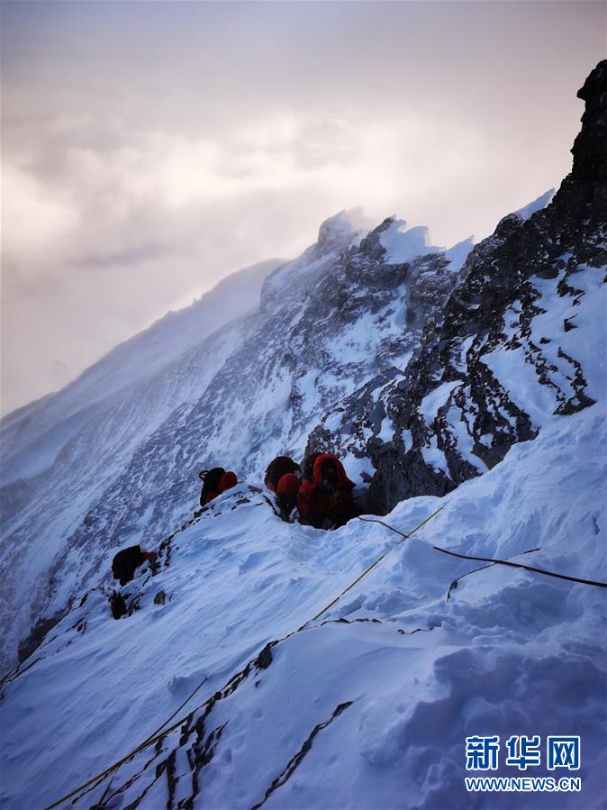 5月27日,2020珠峰高程测量登山队正在向珠峰峰顶挺进。 当日2时10分许,2020珠峰高程测量登山队8名队员陆续从海拔8300米的突击营地出发,向着世界海拔最高的珠峰峰顶挺进。 新华社特约记者 扎西次仁 摄
