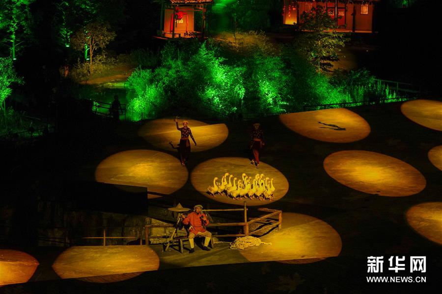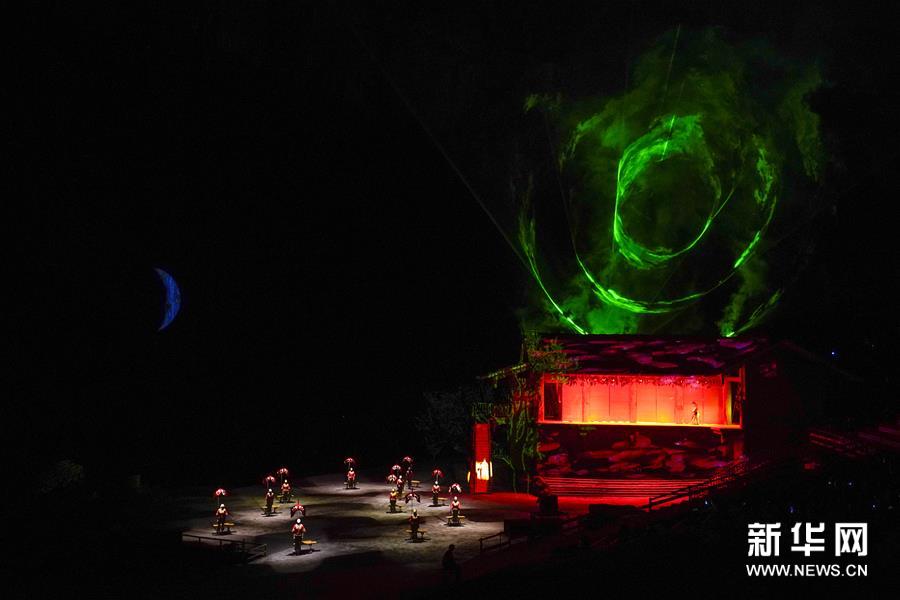 7月29日晚,演员们在《印象武隆》中表演。 7月29日晚,复演后的第89场大型山水实景演出《印象武隆》在重庆市武隆区仙女山镇桃园大峡谷演出剧场上演,当晚的观众数量近700人。据介绍,《印象武隆》自今年5月1日复演后,观众数量在稳步回升。 新华社记者 刘潺 摄