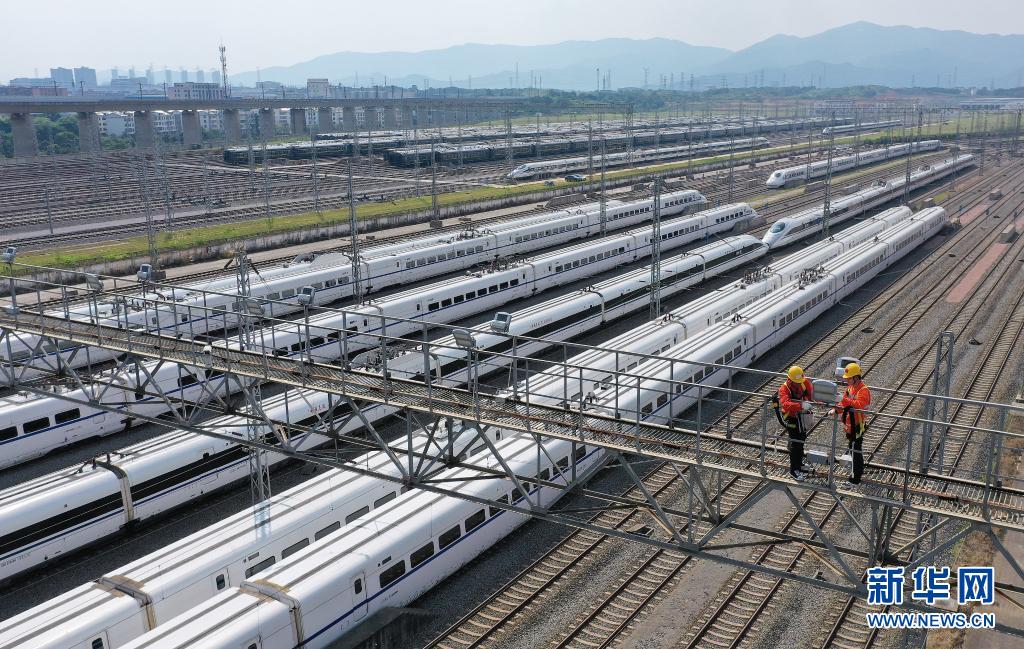 7月14日,电力工人们在南昌西动车所的灯桥上检修照明设施。新华社记者 万象 摄