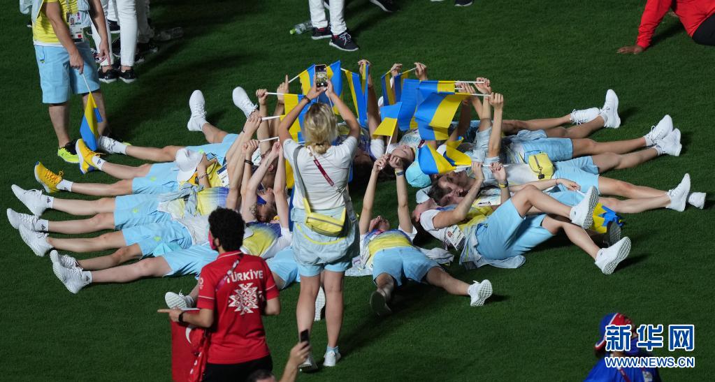 这是乌克兰代表团成员在闭幕式上(8月8日摄)。