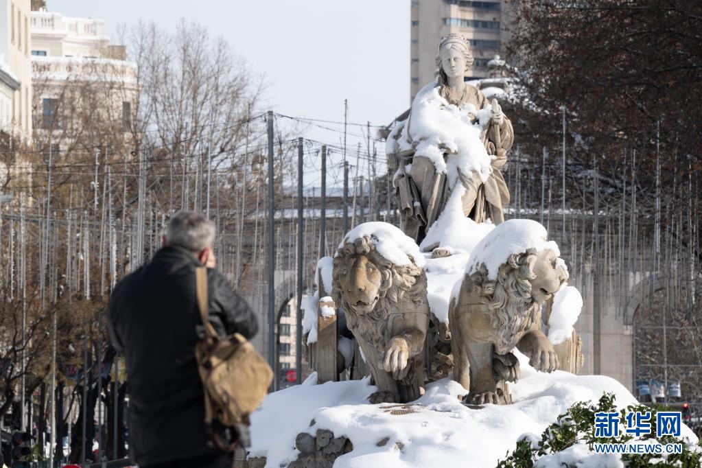 这是1月10日在西班牙马德里拍摄的位于普拉多大道的大地女神喷泉(又称丰收女神喷泉)。