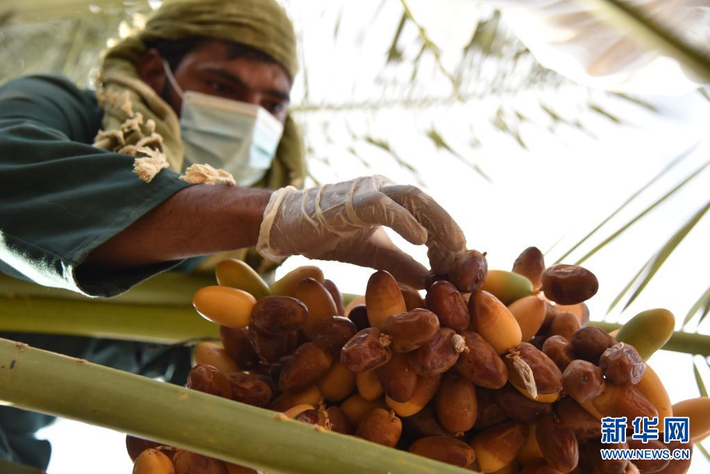 8月12日,工人在沙特阿拉伯加特的一家农场内采摘椰枣。