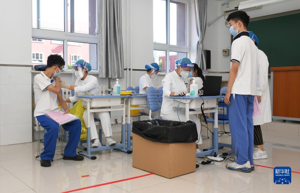 8月21日,学生在北京市育英学校航天校区接种新冠疫苗。当日,航天中心医院的医护人员来到北京市育英学校航天校区,为初一至初三学生进行新冠疫苗接种。新华社记者 任超 摄