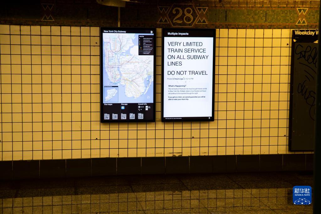 9月2日,美国纽约一处地铁站的电子屏上提示地铁无法正常运行。