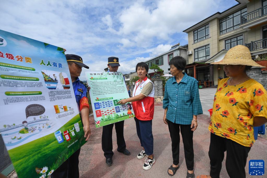 9月16日,浙江省杭州市临安区龙岗镇垃圾分类服务队的党员志愿者给村民们普及垃圾分类知识。