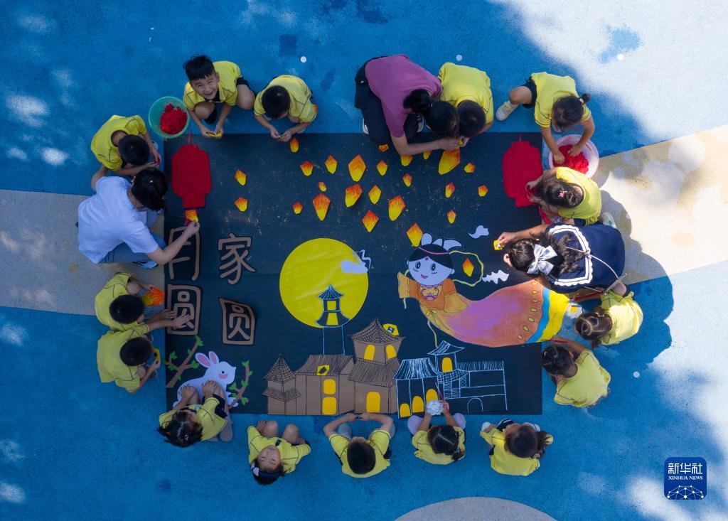 9月17日,孩子们和老师一起制作中秋贴纸画“月圆家圆”(无人机照片)。