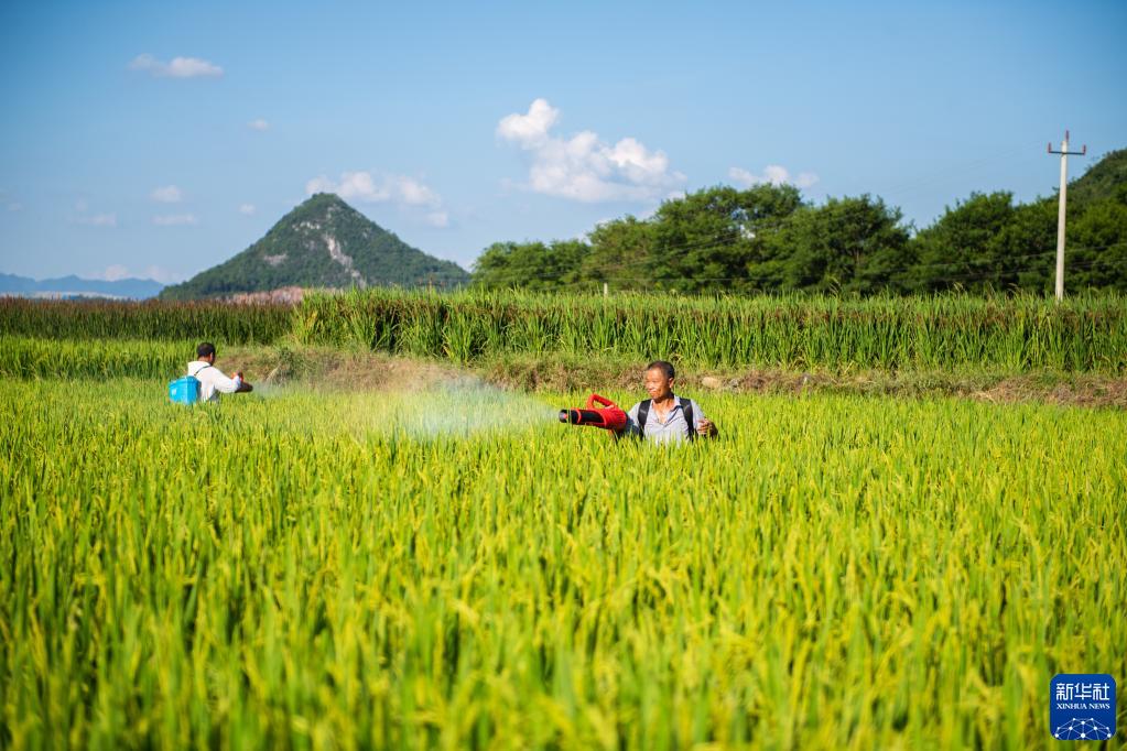 8月30日,在湖南省永州市寿雁镇深田村,村民给水稻施肥。
