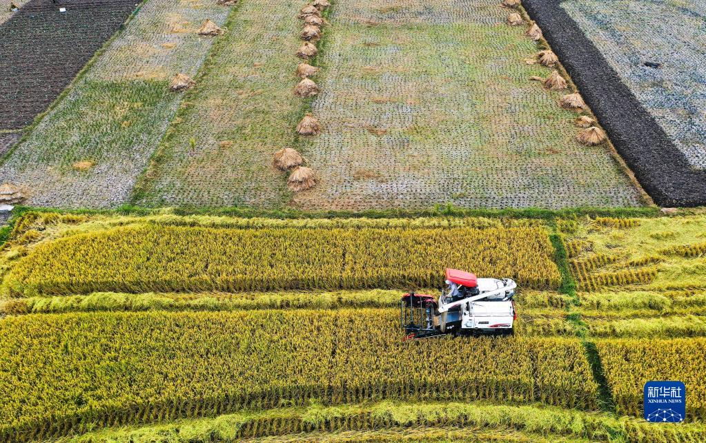 当日是寒露节气,在贵州省黔东南苗族侗族自治州麻江县坝芒乡乐坪村,农民驾驶收割机抢收晚稻,确保颗粒归仓。