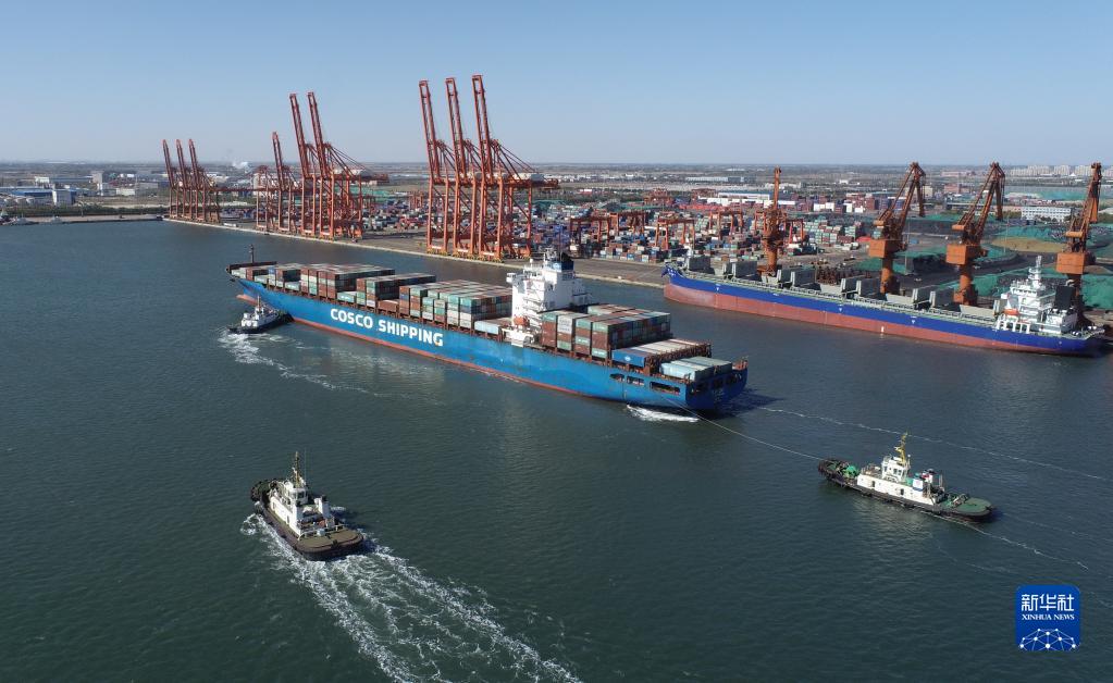 10月23日,一艘轮船向唐山港京唐港区集装箱码头靠泊(无人机照片)。