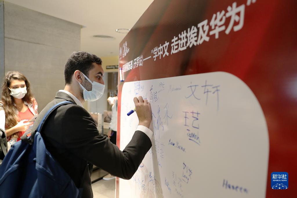 11月10日,在埃及开罗,学生代表在“学中文 走进埃及华为”活动签名墙上签名。