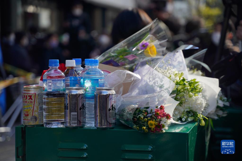 12月18日,人们在日本大阪的火灾现场附近摆放鲜花、饮料等悼念逝者。