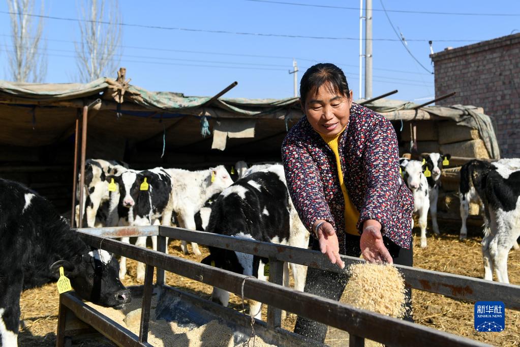 1月19日,巴彦淖尔市临河区干召庙镇胜丰村村民薛喜梅在牛圈内投放饲料。