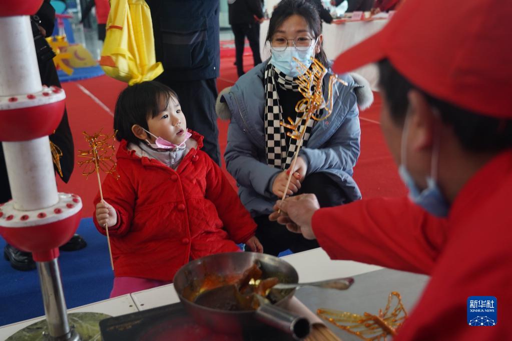 1月29日,在南昌西站候车大厅,民间艺人向小旅客赠送糖画。