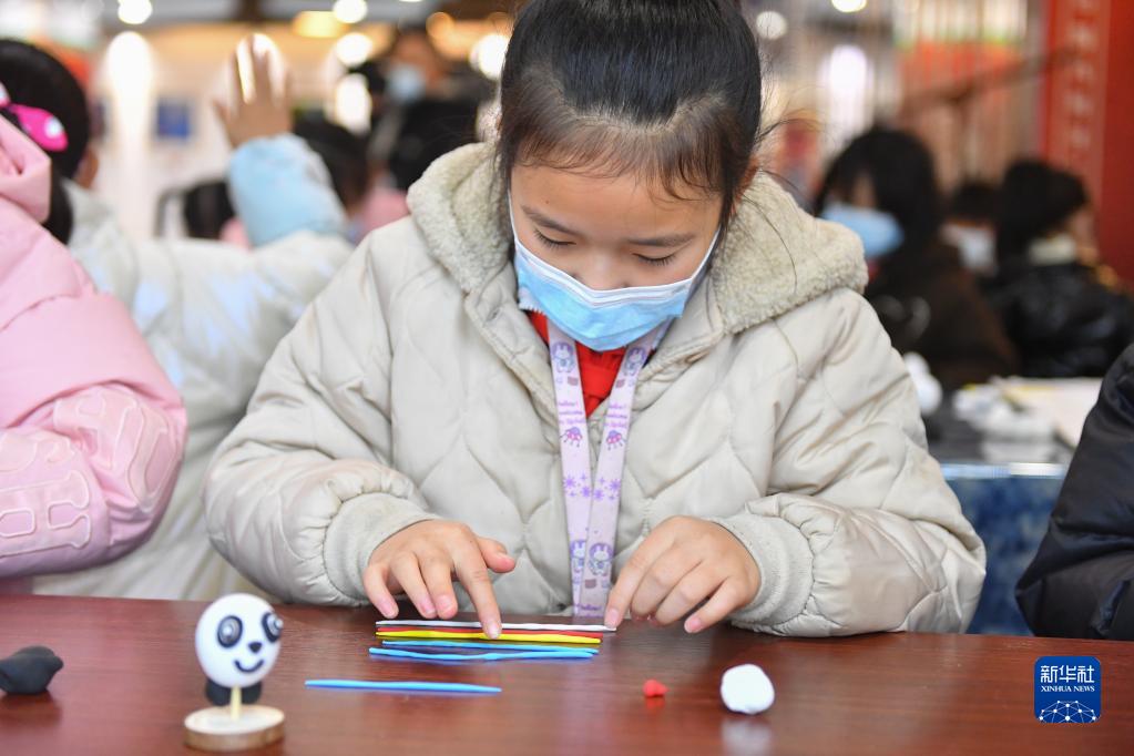 2月13日,在长沙雨花非遗馆,小朋友学习捏制“冰墩墩”。