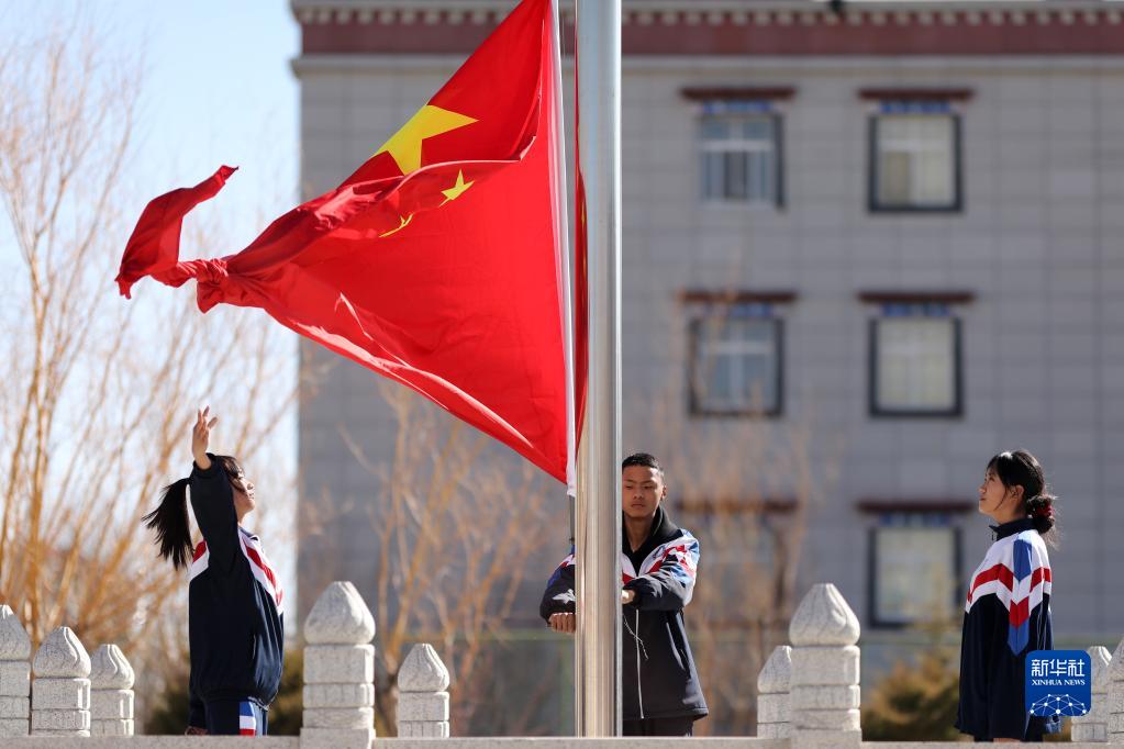 3月10日,拉萨市江苏实验中学学生在开学升旗仪式上。