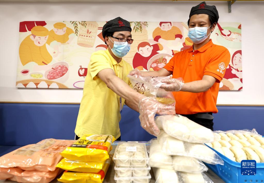 4月10日,上海老盛昌徐江区梅陇路店员工黄庆(右)、任海在恢复营业的店内为网上订单打包。