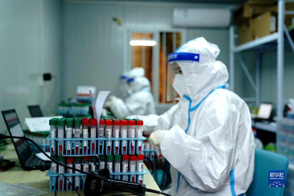 4月15日,检测人员在核子华曦核酸检测方舱实验室的样本扫码间忙碌。