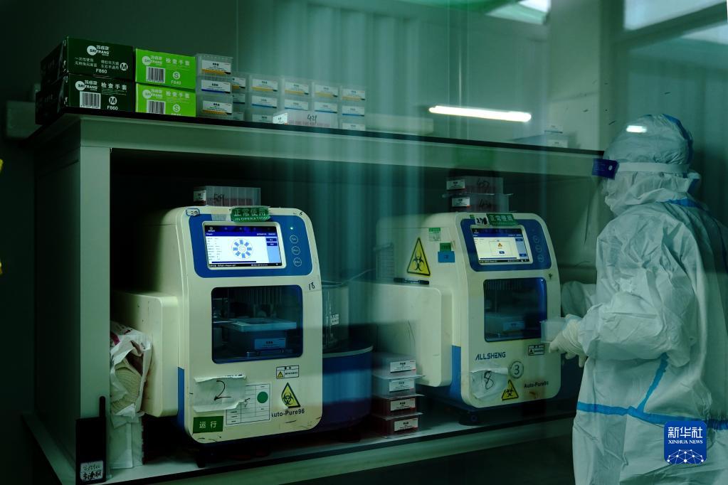 4月15日,检测人员在核子华曦核酸检测方舱实验室里忙碌。