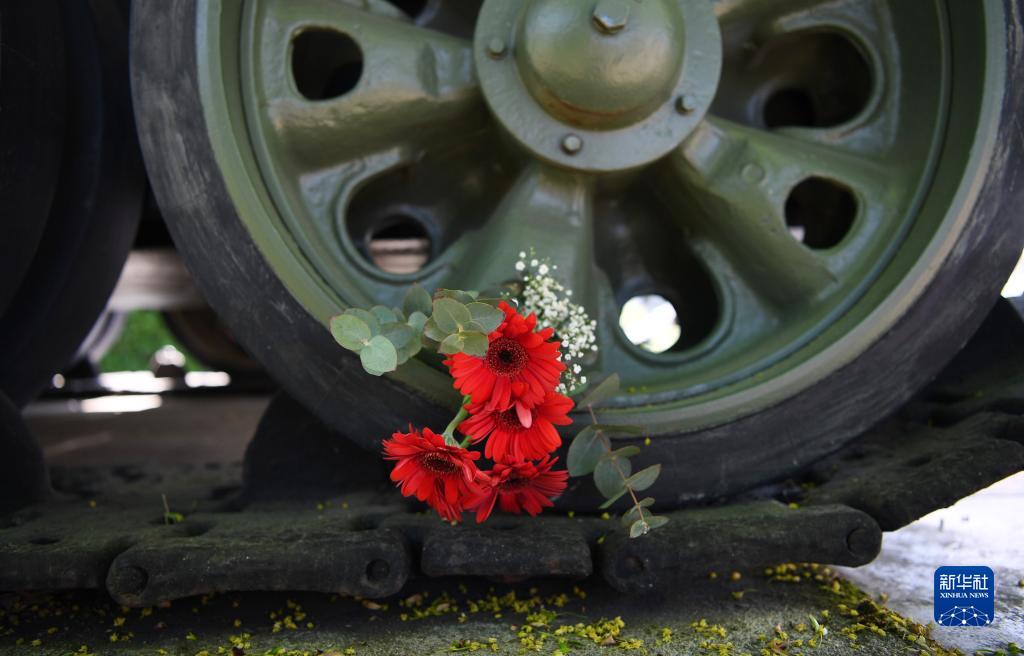 5月8日,在德国首都柏林的德俄博物馆,一辆用于展览的坦克轮子上插着鲜花。新华社记者 任鹏飞 摄