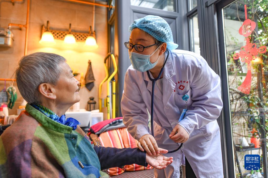在四川省成都市温江区万春镇天乡路社区居民家中,家庭医生杨静(右)在询问居民叶茂群近期的身体情况(2022年5月18日摄)。新华社记者 王曦 摄