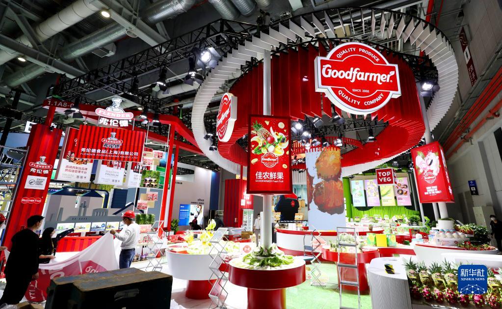 11月2日,工作人员在佳农鲜果进博会展台进行布展工作。