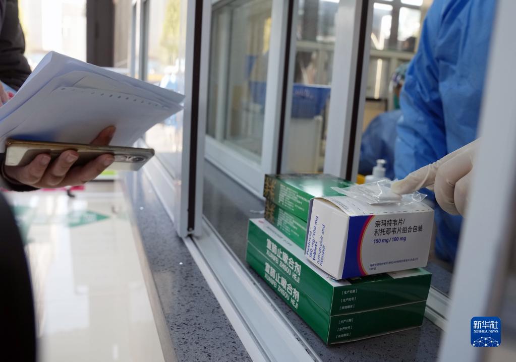 1月4日,在上海市松江区九亭镇社区卫生服务中心发热门诊,药房人员在窗口向患者家属发药。