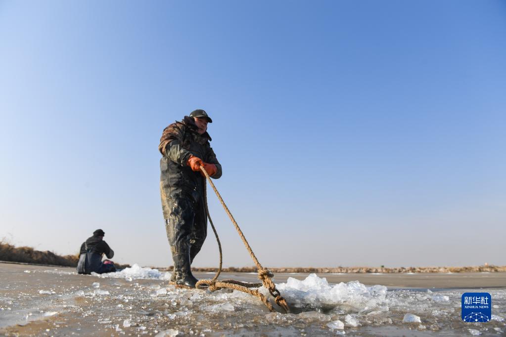 1月5日,达拉特旗树林召镇的村民在鱼塘冰面上作业。