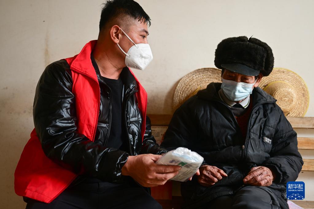 1月7日,在海南省文昌市铺前镇地太村,村干部向高龄老人发放防疫“健康包”,并介绍防疫物品使用方法。