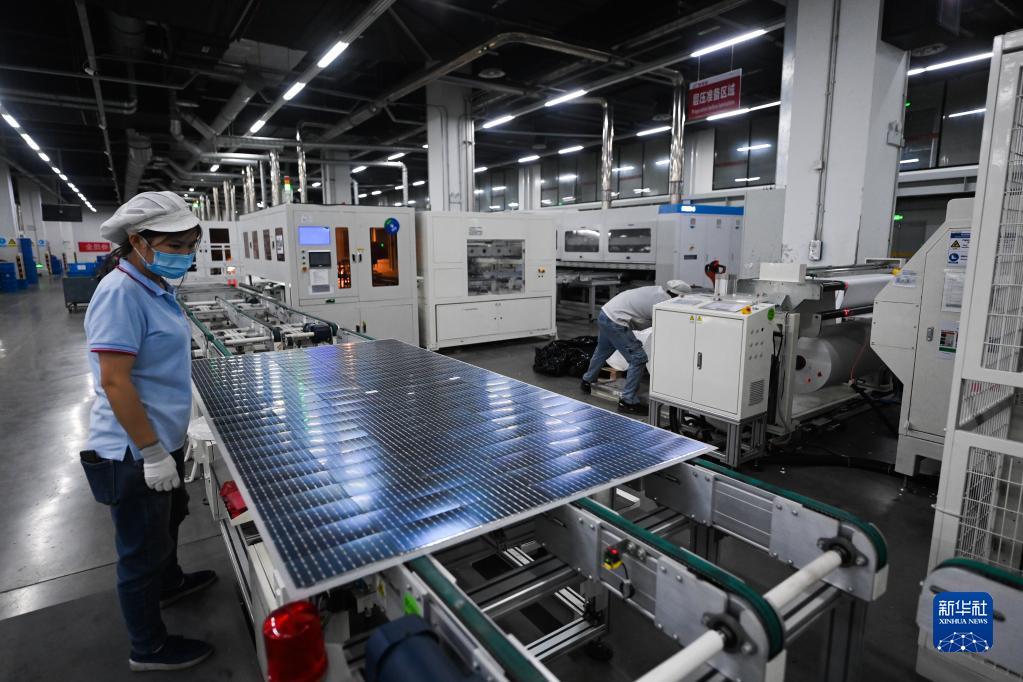 1月10日,在位于嘉兴秀洲光伏小镇内的一家科技有限公司,工人在查看刚生产出来的光伏设备组件。