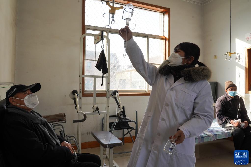 1月10日,山东省济南市长清区大崮山村卫生室全科医生王玉新为前来输液的村民换药。