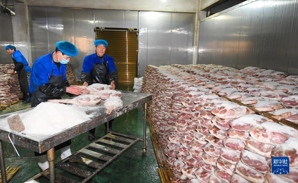 1月10日,在金华市婺城区雅畈镇一家企业,工作人员在腌制火腿。