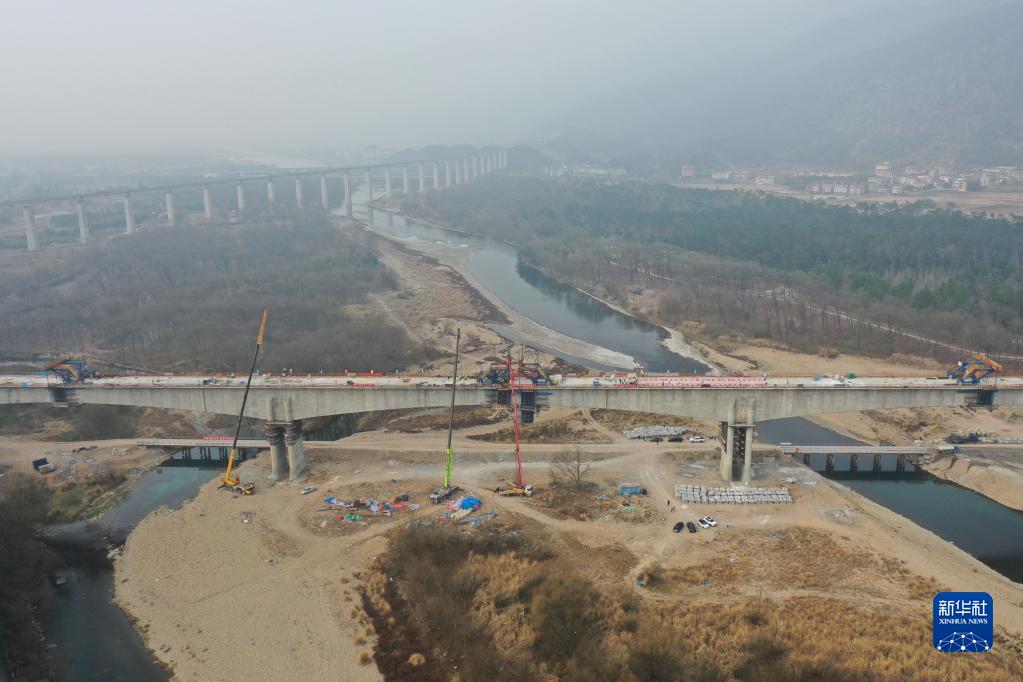 1月10日拍摄的杭温铁路仙居特大桥五连跨刚构连续梁(无人机照片)。该连续梁同时上跨既有公路线、县道和溪流。