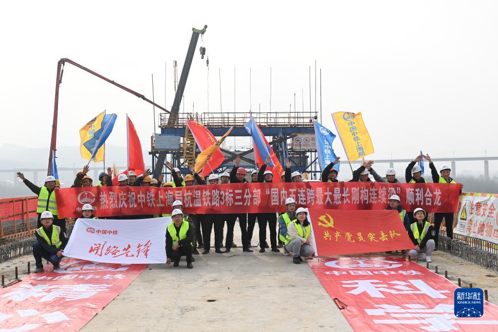 1月10日,中铁上海工程局建设者在杭温铁路仙居特大桥上庆祝连续梁顺利合龙。