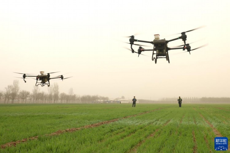 3月22日,在石家庄市栾城区温家庄村,工作人员操作植保无人机为小麦施撒叶面肥。