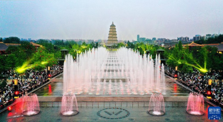 陕西西安大雁塔北广场音乐喷泉是西安旅游打卡地之一,每天会进行四场演出,吸引市民和游客前来观看。
