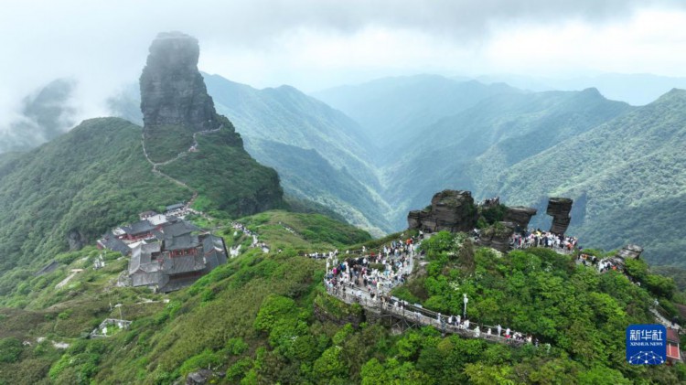 5月27日,游客在位于贵州省铜仁市的梵净山景区游览(无人机照片)。