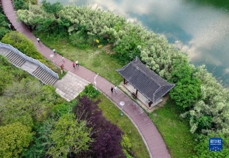 5月27日,人们在贵州省遵义市正安县北郊湖湿地公园景区游玩(无人机照片)。