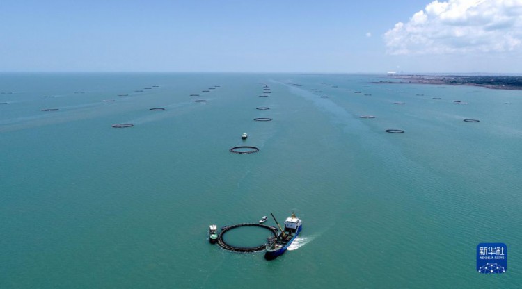 5月27日,在湛江市徐闻县西连镇,渔业工人从徐闻国桥深海养殖有限公司的金鲳鱼深海网箱捕鱼(无人机照片)。
