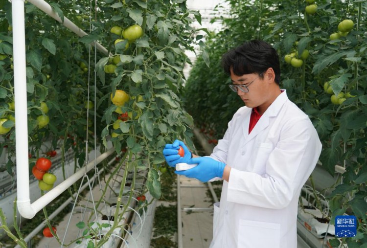5月28日,在位于平谷区峪口镇的京瓦温室园艺示范园,西樊各庄科技小院驻村大学生王萌测量番茄果实的可溶性糖含量。