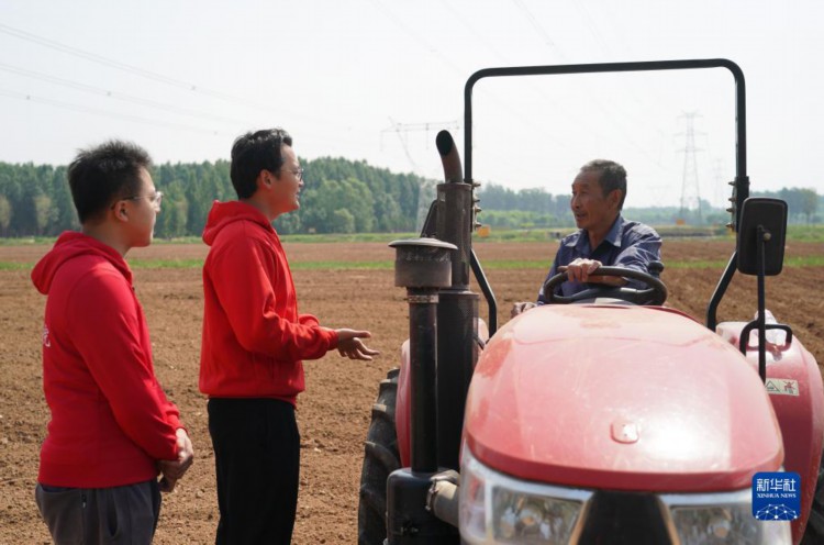 在峪口镇西樊各庄村,西樊各庄科技小院驻村大学生王萌(中)与陶阅兵(左)与当地村民交流播种计划(5月24日摄)。
