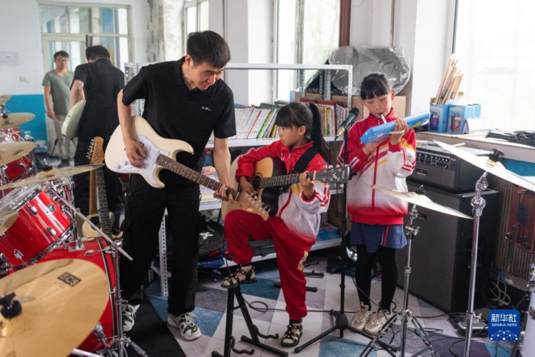 5月29日,在安达市任民镇中心小学,音乐老师李平指导音乐班的孩子进行乐队排练。