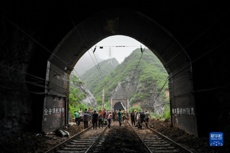 8月1日,在北京市门头沟区水峪嘴村附近一段被阻断的铁路线上,中铁六局工作人员在清理轨道上的杂物,全力恢复交通。