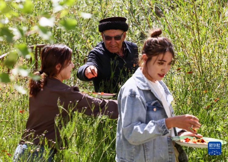 9月4日,村里的年轻人前来巴依卡老人家中,帮助他采摘家里种植的雪菊。新华社记者 兰红光 摄
