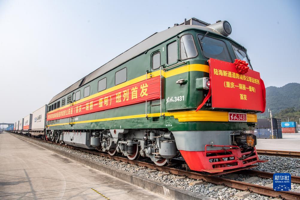 陆海新通道跨境铁公联运班列(重庆—瑞丽—缅甸)首发班列在重庆江津小南垭铁路物流中心等候发车(2023年4月3日摄)。