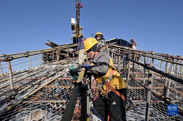 11月26日,工人在河北省唐山市丰润区粮食安全应急储备及食品深加工全链化综合生产基地项目建设工地施工。