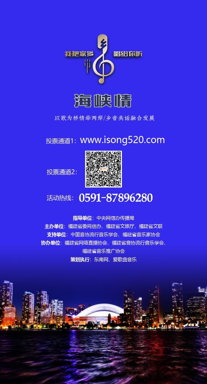 我把家乡唱给你听?家乡有太多的东西,刻在记忆深处。 是一座千年古城! 是一场风土人情! 也可能是一首优美童谣! 或是一句土的掉渣方言。 “我把家乡唱给你听·海峡情“海峡两岸音乐作品网络征集评选活动,挑动众多音乐人心弦。本期展播的五首歌曲,音乐人用歌声唱出自己的”家乡“,有情怀,也有满满的烟火气。 “我把家乡唱给你听·海峡情“海峡两岸音乐作品网络征集评选活动网络投票环节已经结束,进入专家评审阶段。本届活动共征集到的歌曲574首,其中台湾音乐人投稿117首,竞争十分激烈。