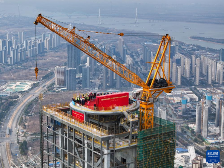 这是1月16日拍摄的南京金融城二期(东区)项目主体结构(无人机照片)。 当日,由中建四局承建的南京金融城二期(东区)项目主体结构全面封顶。据介绍,该项目位于南京市建邺区,由南京紫金投资集团建设运营,总建筑面积约42.9万平方米,包含2栋超高层及4栋配套裙楼,其中主塔楼总高度为416.6米,是集办公、酒店、公寓、商业于一体的超大型综合性建筑群。 新华社记者 李博 摄