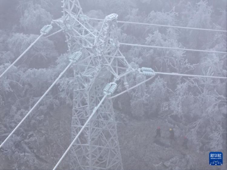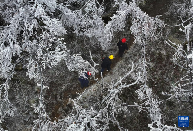2月26日,在桂林市全州县东山瑶族乡,抢修队员上山观察线路覆冰情况(无人机照片)。 连日来,受冷空气影响,广西桂北高寒山区出现低温雨雪冰冻天气,导致电力线路覆冰,南方电网广西电网公司启动低温雨雪冰冻灾害Ⅲ级应急响应,及时组织电力抢修队伍,开展防冰抗冰应急处置工作,保障电网安全稳定运行和电力可靠供应。 新华社记者 黄孝邦 摄