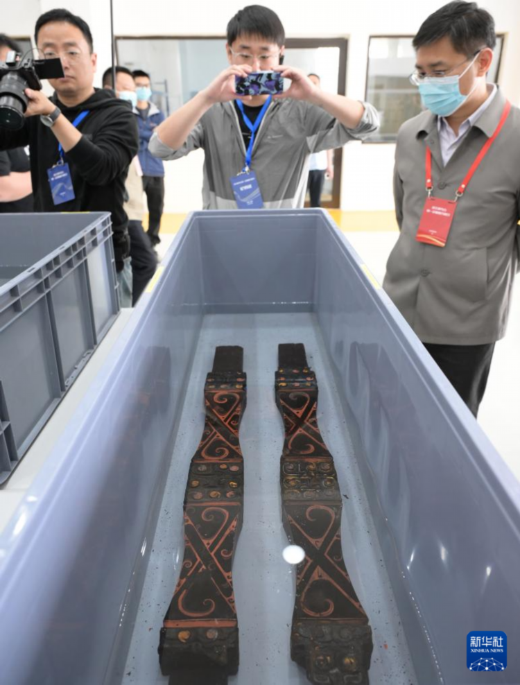 这是4月16日在武王墩墓考古实验室内拍摄的出土浮雕彩绘漆木构件。新华社记者 李贺 摄
